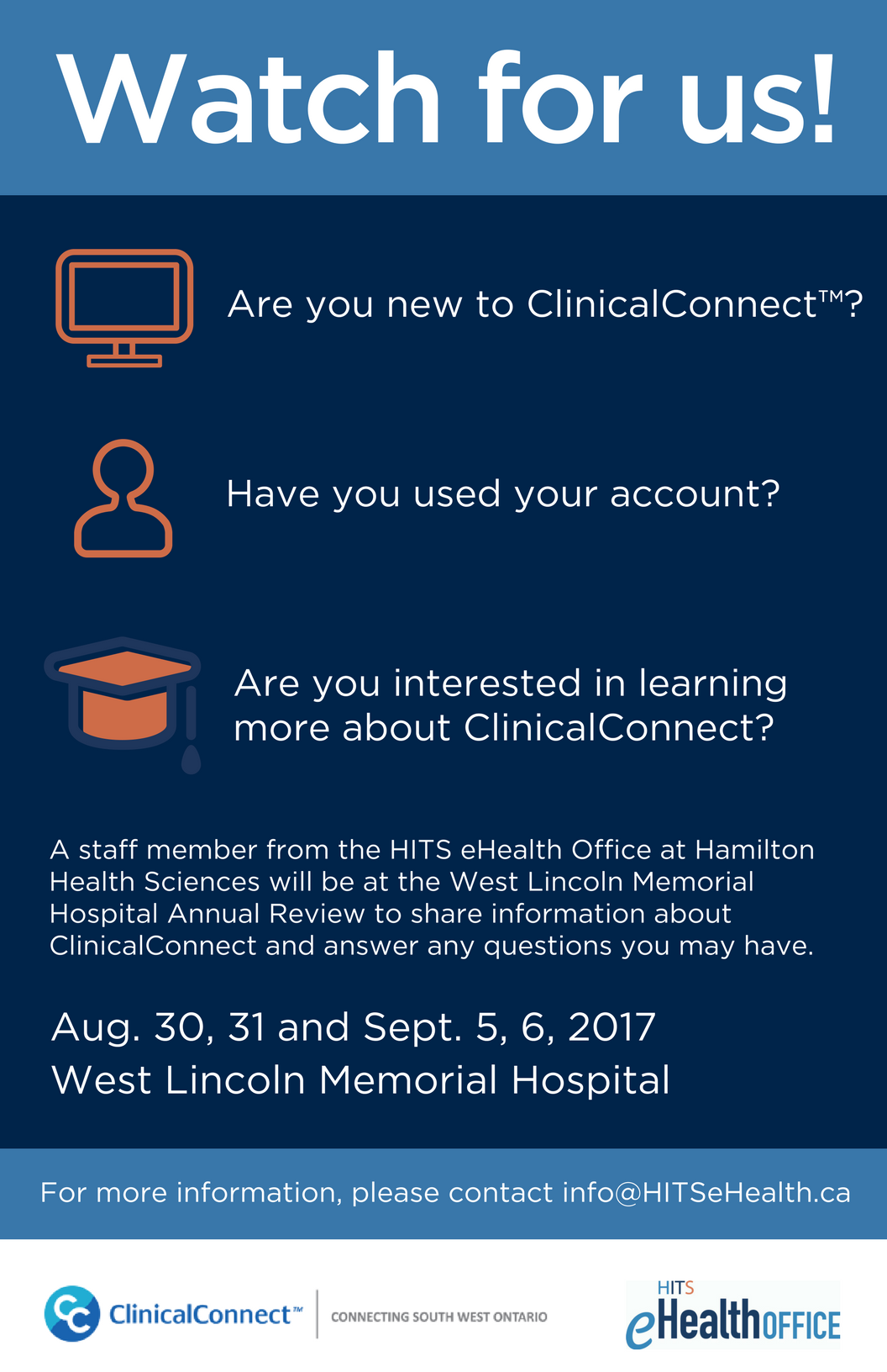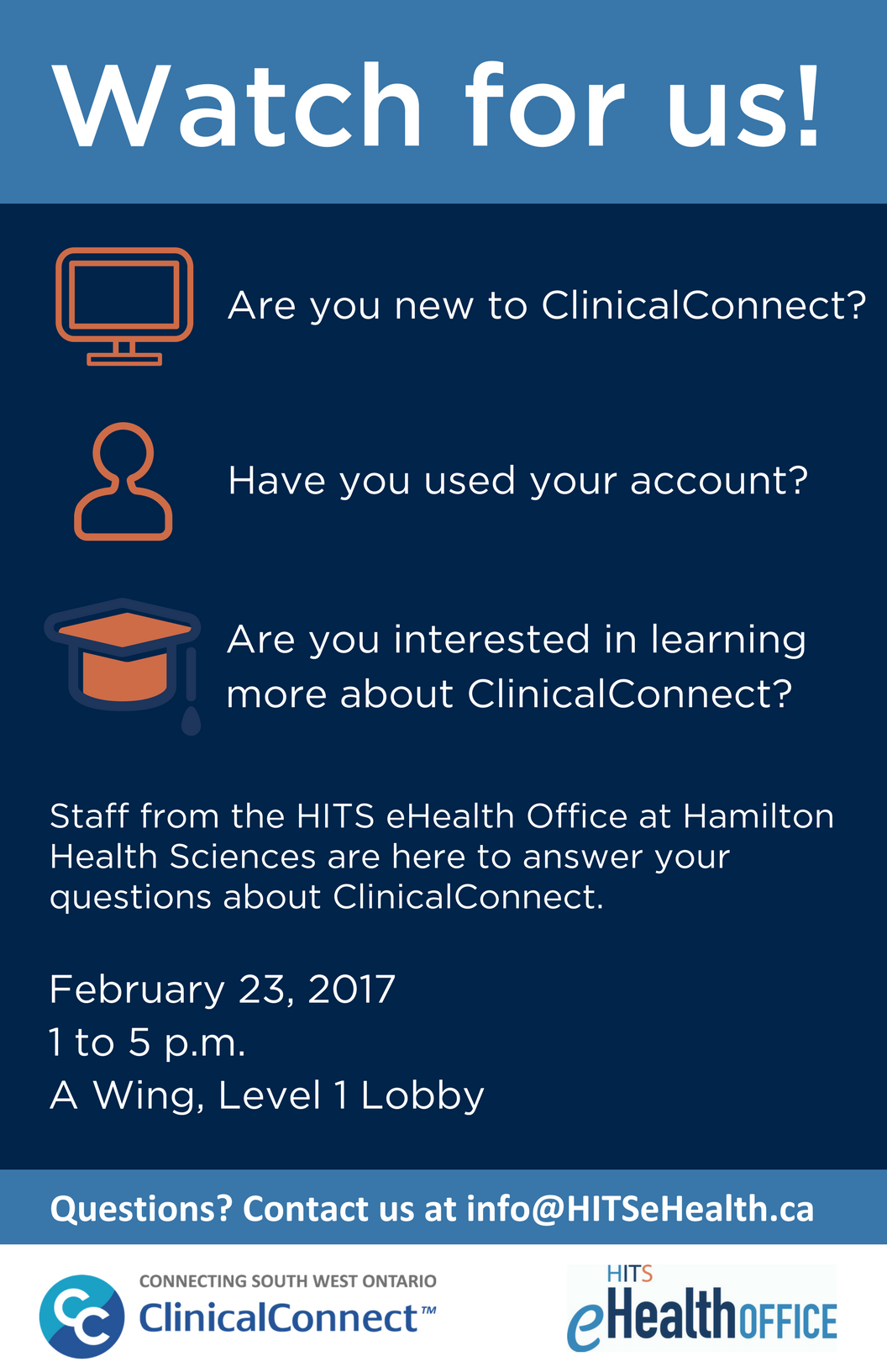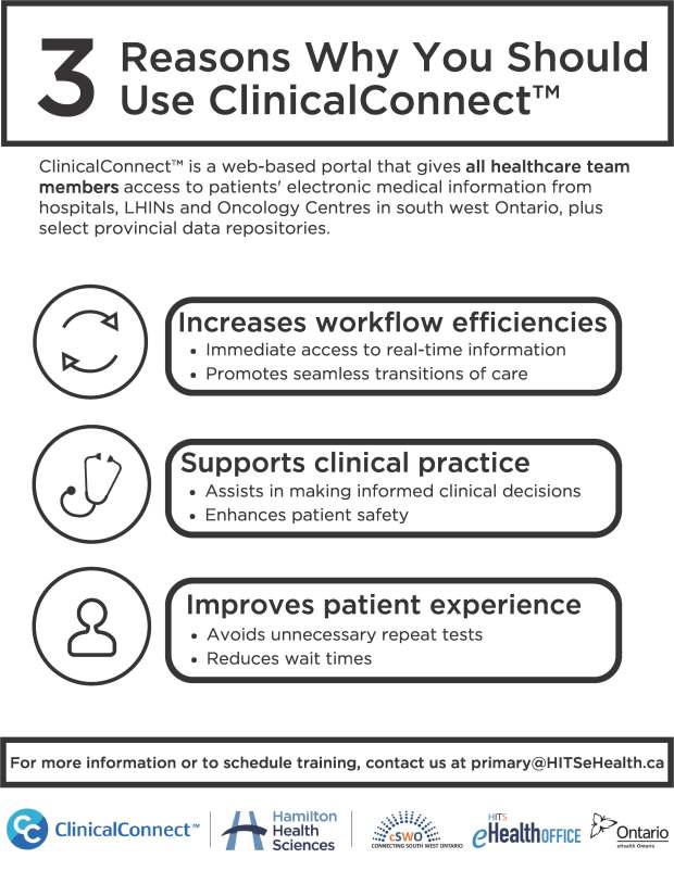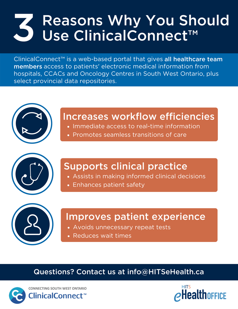The flyers have been used at information kiosks by HITS eHealth Office staff and shared electronically, resulting in increased awareness of the ClinicalConnect solution and the HITS eHealth Office’s role in delivering the solution.